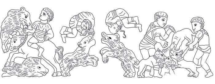 Рис. Ч14. Прорисовка плиты с изображением цирковых сцен, ок. 500 г. (рис. Д. Т. Керимовой). Слева направо: всадник на быке сражается со зверьми (львом и медведем?); акробаты прыгают над зверьми (медведями?); бестиарии травят кабанов собаками