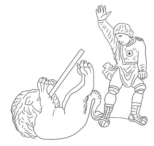 Рис. Ч8. Прорисовка фрагмента диптиха «Травля зверей». Прасин (?) поразил льва ко пьем в пасть (рис. Д. Т. Керимовой)