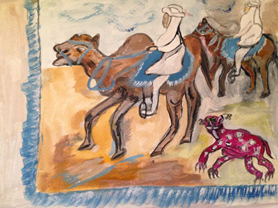 старинной охоты. Люди в странных белых одеждах скакали на горбатых лошадях, а рядом бежали незнакомые животные. Она начала было разглядывать изображения на ковре, как услышала стон. Отвернув ковер, она увидела небольшую металлическую дверь. В замочную скважину был вложен ключ. Девочка смело повернула его и открыла дверь.
