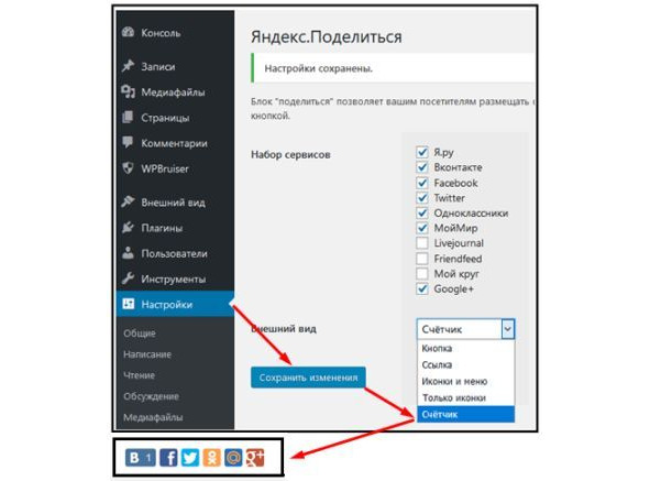 Плагин Яндекс. Поделиться позволяет выбрать необходимые вам кнопки социальных сервисов и оформление блока. Наиболее интересным представляется вид блока кнопок в виде счётчика на кнопках отображается количество человек, отправивших ссылку на просматриваемую страницу, в разные социальные сервисы.