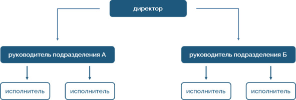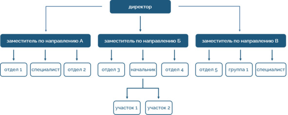 Самая простая модель: прямая и строгая иерархия. Ключевые решения принимаются сверху и спускаются вниз, без выделения отдельных функций: продажи, маркетинг, производство. Подходит для небольших компаний с простой технологией производства и минимальной потребностью в дополнительных функциях.