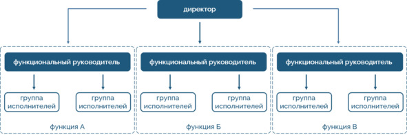 Распределение обязанностей происходит по выполняемым функциям: производство, продажа, маркетинг, бухгалтерский и налоговый учет, финансовое управление. В итоге каждый занимается своим направлением. Оптимальна для небольших компаний, которые работают с одним продуктом, но требуют уже более сложной организации производства.