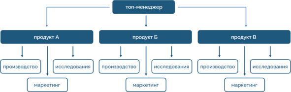 Похожи на линейную структуру, но подразделения выстраиваются по принципам разделения на продукты или рынки сбыта. Оптимальна для компаний с большим количеством рынков сбыта и разнородных продуктов. Для таких предприятий необходимо создавать индивидуальные основные бизнес-процессы для каждого продукта / региона: снабжение, производство, маркетинг, продажи.