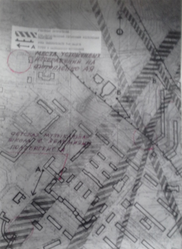 Представление об этой карте дает сохранившаяся схема района ЛВРЗ с определенными зонами и точками съемки аномальных явлений (указано направление фотографирования). Нанесенные на ней области с темными полосками это геопатогенные зоны линейного типа.