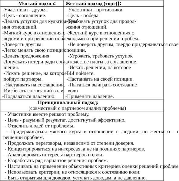 Первый и второй подходы определяют стратегическую линию двух вариантов (жесткого и мягкого) ведения переговоров по типу позиционного торга, а третий вариант определяет особенности ведения принципиальных переговоров-наиболее прогрессивного современного вида переговоров.