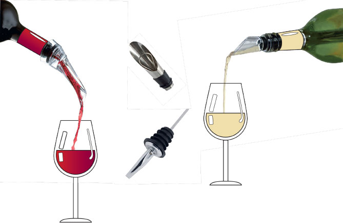Дозаторы и аэраторы разного дизайна, часто применяемые во время розлива вина на профессиональных дегустациях для стабильности дегустационной порции и одновременной аэрации вина