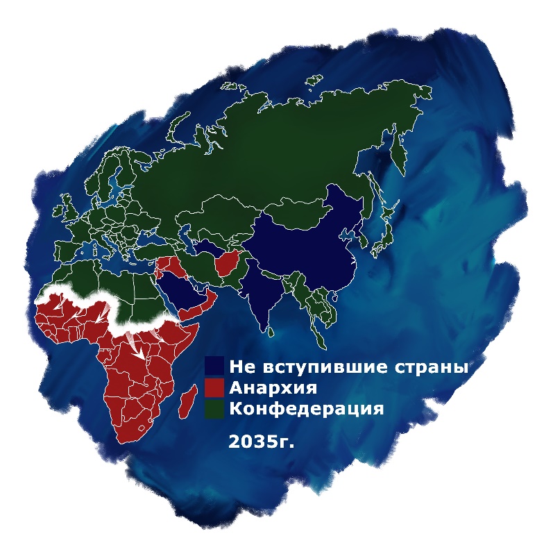 В конце 2035 года началось масштабное наступление сил Конфедерации на Африканский континент. С территории Испании, Италии, Греции и Турции начала осуществляться массовая переброска войск в Марокко, Ливию, Алжир и Египет. Территории этих стран являлись плацдармом для будущего наступления вглубь Африки. Конечной целью этой операции было протянуть параллельную фронтовую линию от Африканского Рога, разделяющую континент пополам. Командование опасалось того, что не сможет вобрать в себя весь материк целиком, и планировалось провести операцию в два этапа. Численность войск Конфедерации на момент высадки в Африке составляла более 3 млн солдат с поддержкой разных видов войск, но этого было недостаточно. Получая регулярное подкрепление со всего мира, размеры войск Африканского контингента стремительно росли. Чтобы мобилизовать достаточное количество солдат, в союзном командовании было предложено сформировать африканский легион, состоящий из бывших военнослужащих из разных стран Африки. Новая волна мобилизации на захваченных территориях должна была подкрепить регулярные воинские подразделения на захваченных территориях. В неспокойных регионах континента армия была тем инструментом, без помощи которого контроль был бы утерян.