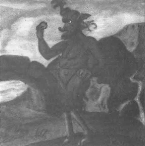 В общем, вернемся к нашему первоначальному предположению о том, что дьявол, которому художник продал душу, должен был заменить ему отца. Нашему предположению соответствует и то, что впервые дьявол явился художнику в обличии добропорядочного горожанина в летах, с седой бородой, в красном плаще и черной шляпе, с тростью в правой руке и черной собакой (таким он изображен на первом рисунке)22. Со временем облик его становится все ужаснее, можно сказать, приобретает мифологические черты: у него появляются рога, орлиные когти и крылья как у летучей мыши. В конце концов, он является в часовне в обличии летающего дракона. Об одной детали его физического облика мы еще поговорим отдельно.
