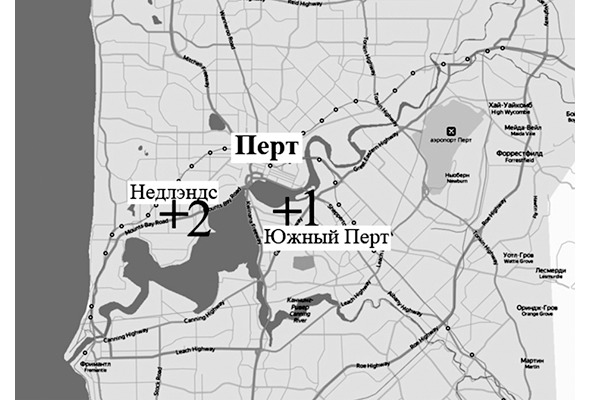 Карта Пертской агломерации (г. Перт и его пригороды) с указанием мест нападений на Пнину Беркман (+1) в Южном Перте и Эликс Донкон (+2) в Недлэндсе в январе и августе 1959 г. соответственно. Оба района считались в то время местами благополучными и вполне безопасными. Немотивированные ночные нападения на молодых женщин выглядели чем-то экстраординарным, выходящим за рамки обычной криминальной активности.
