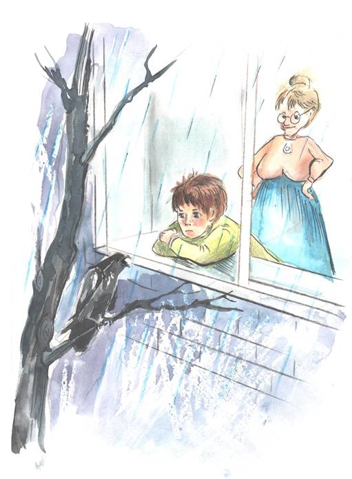 Боря представляет, что ворона это бабушка Жанна, и ему становится смешно. Потом в голову закрадывается мысль, что, может, птице просто некуда лететь, поэтому она терпит и ветер, и дождь. Нет у неё ни друзей, ни родни, как у бабушки Жанны, у которой только Боря и его мама с папой.
