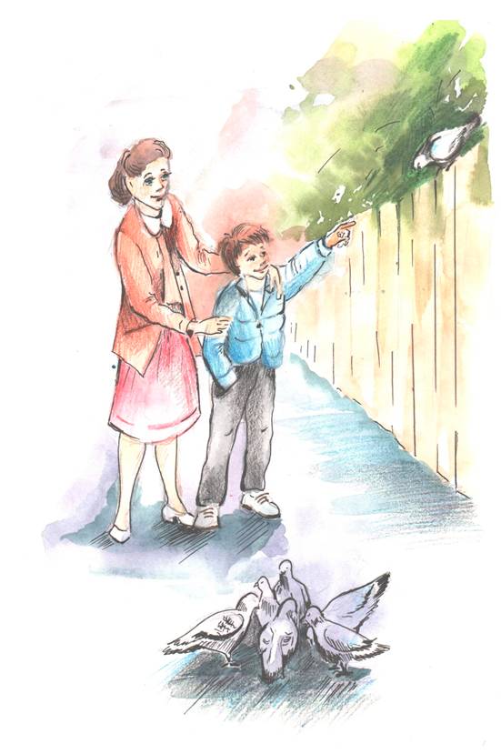 Анна Витаминовна шагает следом. Вдруг она останавливается. Оглядывается. Смотрит на голубей. Наверное, размышляет, стоит согласиться с тем, что на территорию садика прилетает король, или нет.