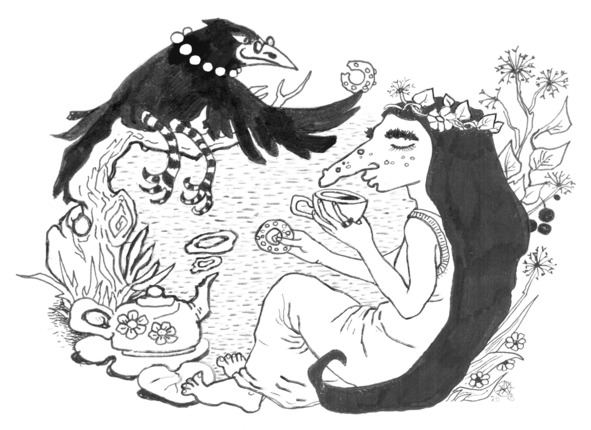Вокруг кочки плавали листья кувшинок. На них стояли чайник с отколотым носиком, ваза с черничным вареньем, битая кружка с чаем из тины, а из бутона лилии торчали плесневелые сухари.