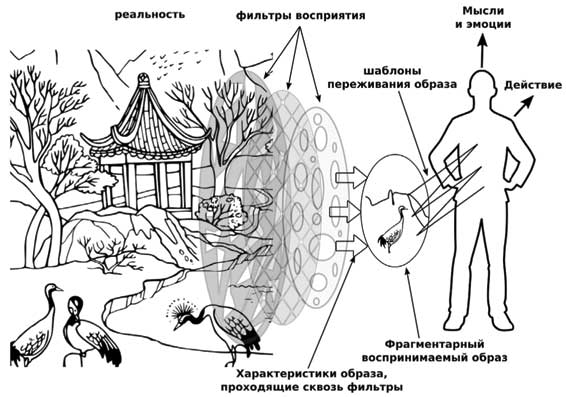 Все эти три фильтра составляют основу ментальной конструкции эго. Нейрофизиологический аппарат, социальные и личностные предписания являются той самой подсознательным фундаментом, отлаженным с годами механизмом, который формирует уникальную для каждого человека личную реальность. Так и получается, что своим выборочным восприятием именно сам человек избирает, что для него реально, а что нет, а так же выбирает способы реагирования из тех записанных установок и предписаний, которые удалось накопить за жизнь. Так человек воспринимает только малую долю настоящей реальности, которой удалось просочиться через все эти фильтры. Следовательно, каждый из нас живет в своей собственной изменённой реальности, которую он способен воспринять, а именно во фрагментарной иллюзии, созданной нашим эго.
