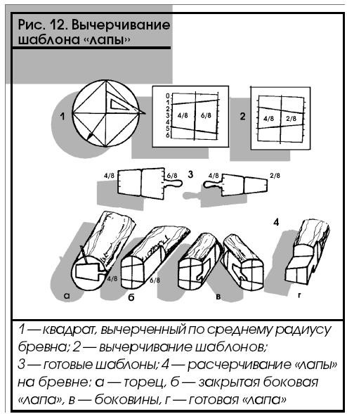 При складывании сруба из бревен получается выход их концов за пределы стен. Очень давно русские плотники назвали такое выполнение углов «в чашу» или «в обло». Это соединение концов бревен проверено временем, оно делает сруб прочным и хорошо защищает углы от ветра и дождя. С помощью шаблона, который делается из фанеры, толстого картона, нужно разметить «закрой «лапы».