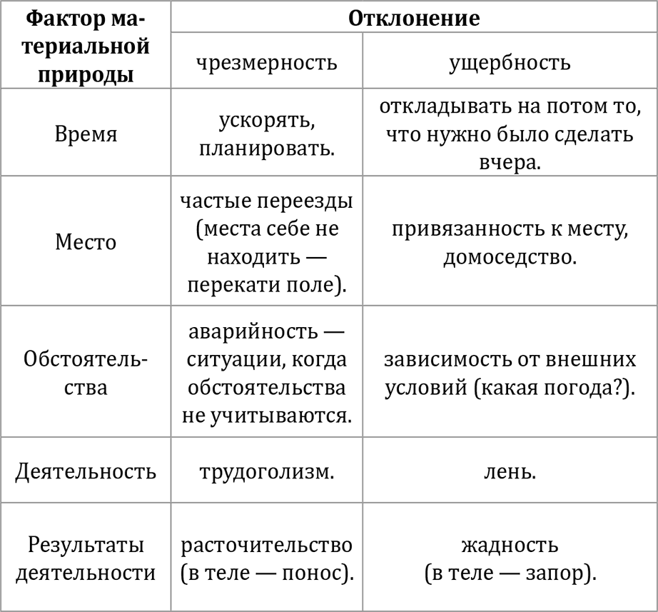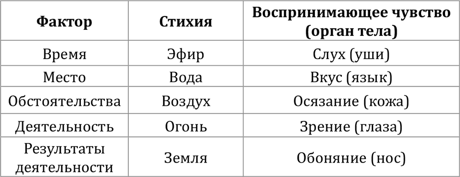 Приведём соответствие 5 факторов материального мира пяти стихиям и воспринимающим чувствам: