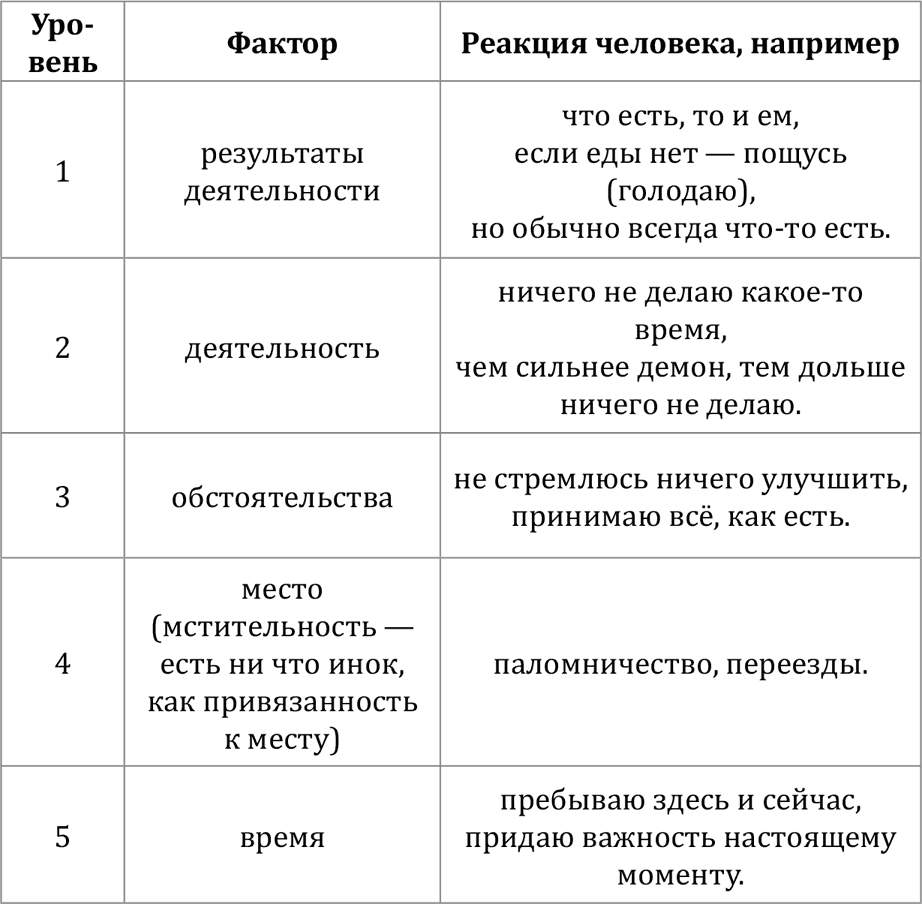 Одержимость пятью факторами материального мира демонизм. Это ситуация, когда не человек влияет на мир как творец нового, а мир влияет на человека, и человек начинает подстраиваться под мир (прогибаться под него), отступая от своей истинной Божественной природы, и адски страдает от этого.