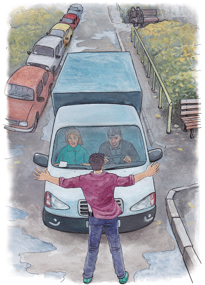 «Ду рак, ду рак», стучала кровь в висках, пока он бежал по лестнице, преодолевая по 2 пролёта разом. Машина уже тронулась, когда он выбежал из подъезда. В окне проплыло её напряжённое лицо: она сидела рядом с водителем. Практически не думая, он выбежал на дорогу перед грузовиком. Водитель ударил по тормозам, и «Газель», как в американских фильмах, остановилась, чуть толкнув его бампером.