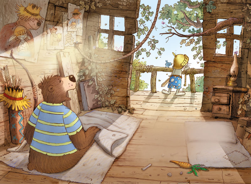 Заяц и Медведь начали торопливо слезать вниз по лестнице со ствола дуба, в котором они жили.