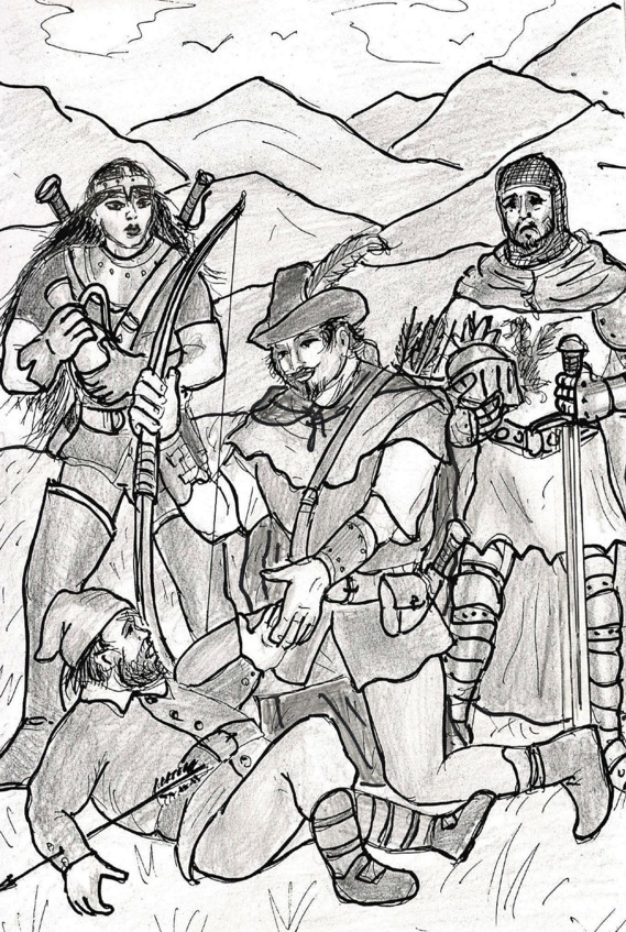 Всё происходило на большой поляне, за пределами которой стеной стоял вековой лес, виднелись на горизонте вершины гор строгий и красивый пейзаж, смутно напомнивший Эрвину какой-то старый рассказ, подслушанный в таверне речного порта. В мозгу пронёсся вихрь воспоминаний и обрывки полузабытых историй Волшебный лучник Печальный рыцарь Боевая фея. Да, это они! Вон за спиной лучника высится фигура в доспехах с таким угрюмым лицом, что и на похоронах будет выделяться, а вон женщина в странном зеленоватом костюме, силуэт которой всё время теряется на фоне леса
