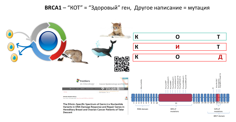 Все хорошо знают американскую актрису Анджелину Джоли. Её мама умерла от рака молочной железы, и причиной опухоли могла стать мутация в гене BRCA1. Доказано, что если есть мутация в этом гене, то вероятность развития рака молочной железы очень высока. У Анджелины была обнаружена такая мутация, и она сделала профилактическую мастэктомию. Анализ на мутации гена BRCA1 не является чем-то эксклюзивным. Во многих клиниках мира и в России делают такой анализ. Что же ищут, делая такой анализ? Представим, что ген BRCA1 пишется словом «кот». При мутации буква «о» меняется на «и», в итоге получается «кит». Все диагностические системы настроены на то, чтобы найти в середине слова именно эту букву «и». Эти тесты хорошо работают в Европе и Америке. Но наши врачи недоумевали, почему у женщин с диагностированной опухолью больше чем в половине случаев мутация в BRCA1 не выявляется стандартным методом, то есть отсутствет буква «и» в середине слова. Именно на этот вопрос нашли ответ ученые Казанского федерального университета вместе с коллегами из Республиканского онкологического диспансера в Казани[10]. Оказалось, что у представительниц определенных этносов мутация в гене BRCA1 происходит не в середине слова, а в конце, то есть вместо слова «кот» появляется слово «код», и ген BRCA1 перестает контролировать повреждения ДНК и вылавливать мутации (рисунок 14).