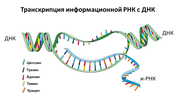 В ДНК информация о белках записана этими четырьмя буквами. Белок похож на бусы, каждая бусинка это аминокислота. Бусинки (аминокислоты) разные, их 20 видов. Из каких аминокислот состоит белок и в какой последовательности они расположены, записано в цепочке нуклеотидов ДНК. Такие участки ДНК и называются генами. Код одной аминокислоты это три буквы в гене. Информация с гена, то есть с ДНК, «переписывается» на информационную РНК (иРНК). Этот процесс называется транскрипция (рисунок 12). Через поры ядерной мембраны иРНК попадает в цитоплазму и встраивается между двумя половинками рибосом. Три буквы кода на иРНК соответствуют какой-то конкретной аминокислоте. Поэтому другой вид РНК транспортная РНК подносит только соответствующую коду аминокислоту. Так последовательно, по три буквы, иРНК продвигается в рибосоме, а к одной аминокислоте добавляется другая до тех пор, пока не сформируется цепочка из аминокислот. Этот процесс называется трансляция (рисунок 6).