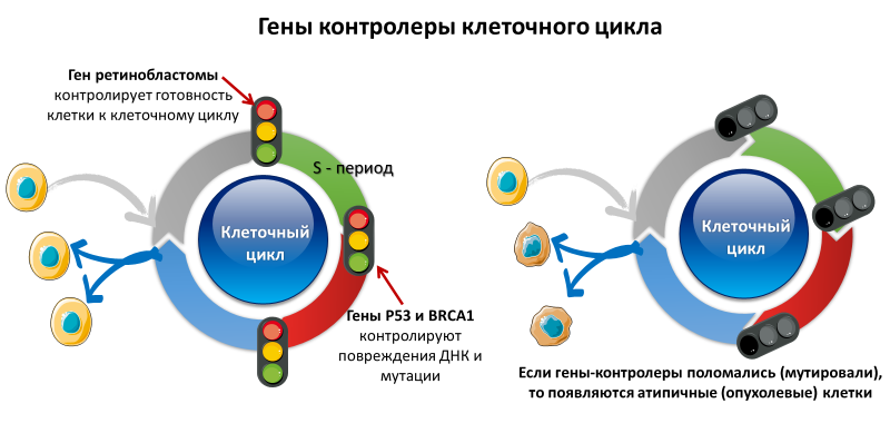 Например, ген ретинобластомы контролирует готовность клетки к клеточному циклу, но не вызывает ретинобластому. Если же этот ген не работает, то возникает опухоль. Гены P53 и BRCA1 контролируют повреждения ДНК и мутации. Если есть какие-то повреждения или мутации в клетке, то они останавливают процесс деления такой клетки (рисунок 13).