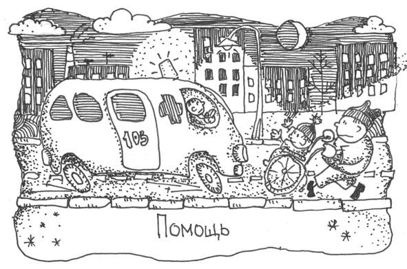 Карлсон неожиданно столкнул коляску с тротуара и выкатил ее на проезжую часть улицы. Прямо в поток машин! Заревел сигнал автомобиля, и в метре от коляски остановилась машина скорой помощи. Карлсон замахал руками водителю. Из пассажирской двери выскочил врач мужчина в сине-зеленой шапочке с красным крестом.