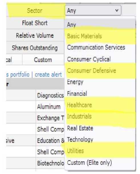 При скрининге акций Вам придется выбрать один сектор. Больше выбрать не получится. Поэтому, например, для начала Вы будете искать акции в секторе «Сырье». По окончанию работы с этим сектором Вы выберите другой, например, «Услуги связи» и снова запустите скрининг.
