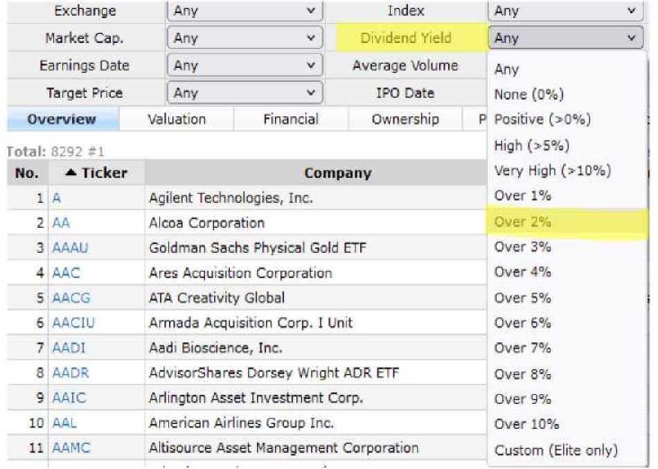 Когда я ищу акции, я обычно устанавливаю фильтр дивидендов на отображение только тех компаний, которые выплачивают дивиденды больше 2%.