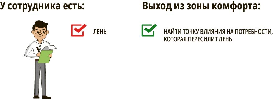 Выход. Нужно найти точку влияния на потребности, воздействие на которую пересилит лень. Тогда такой человек загорится. Но чаще это исключение из правила. Данная категория сотрудников труднее всего выходит из зоны комфорта.