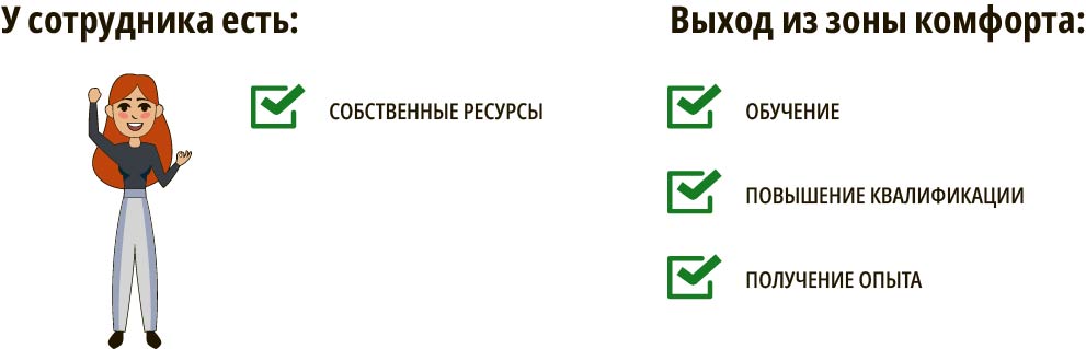 Сотрудников, находящихся в зоне комфорта и не желающих ее покидать, условно можно разделить на три категории, к каждой из которых применяются различные способы выхода из нее.