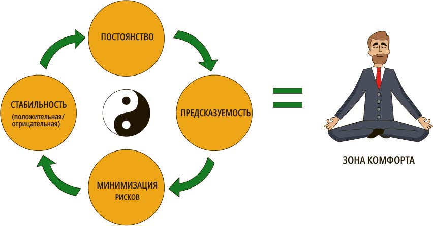 Главное в зоне комфорта стабильность (положительная или отрицательная), предсказуемость, постоянство и минимизация любых рисков. Человеку удобно и комфортно находиться в состоянии покоя и определенности, неизвестность всегда пугает.