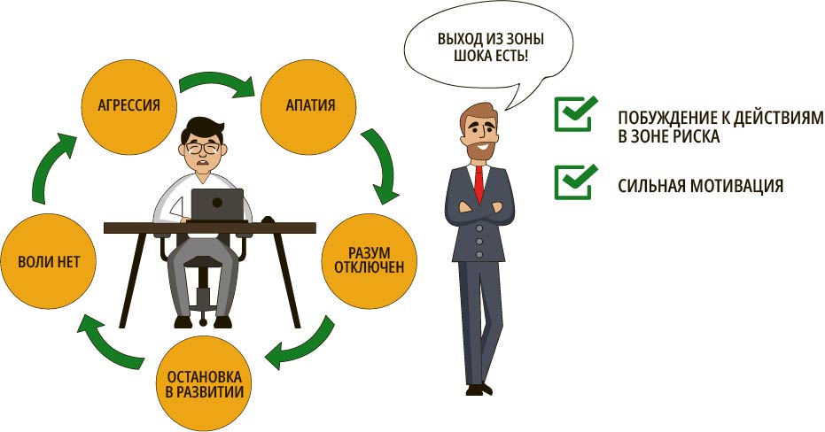 В зоне шока все действия человека определяет аффект, проявляющийся либо в агрессии, либо в апатии, перестают работать воля и разум, наступает кризис, происходит демотивация. Человек постоянно думает о проблеме, вызвавшей шок, и ее последствиях. Большую часть своего времени он тратит на переживания и мысли о проблеме. Он останавливается в своем развитии.