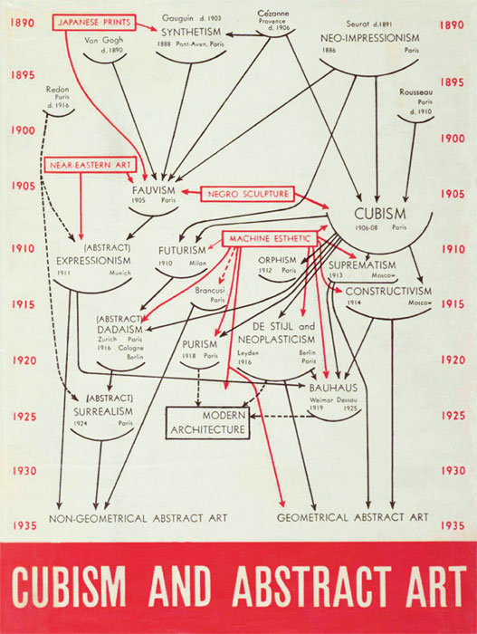 Обложка книги Альфреда Х. Барра-младшего «Кубизм и абстрактное искусство» (1936), где показана связь между художественными движениями конца XIX века, кубизмом и его современниками и направлениями искусства XX века