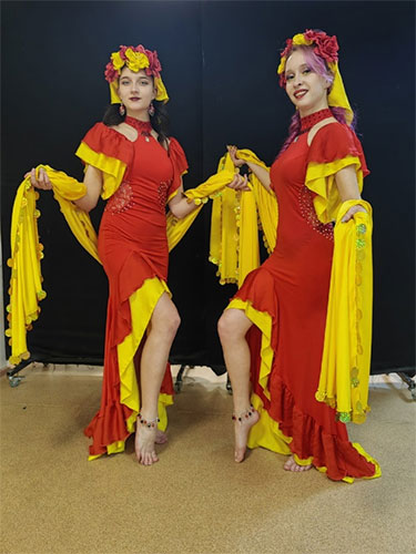 Костюм, также придуманный известным хореографом, представляет собой яркое платье с оборками и асимметричным подолом, голову украшают цветы или помпоны.
