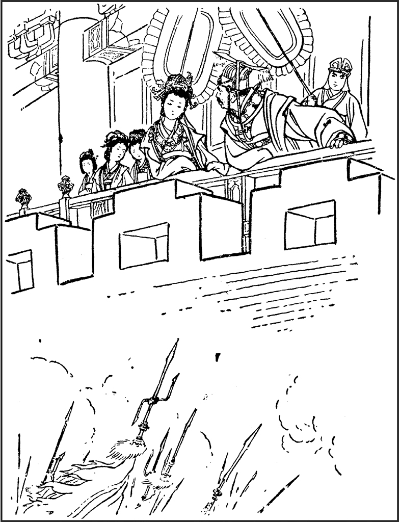 Вечером Го Шифу попросил своих людей зажечь сигнальный костер. Чем дольше горел огонь, тем сильнее он разгорался. Небо озарилось пламенем, костры на башнях загорались один за другим. Далеко и близко, все они походили на огненные столбы, которые были необычайно красивыми и одновременно пугающими. Соседние чжухоу увидели сигнальные костры и подумали, что приближаются западные жуны, поэтому они срочно выдвинули свои войска сражаться с неприятелем. Но добравшись до места, они не увидели врагов, напротив, это совсем не походило на войну, были лишь слышны звуки музыки и пения. Все прибывшие переглянулись, не понимая, что происходит. Ю-ван приказал слуге передать войскам: «Благодарим вас, но врагов тут нет. Это ван и государыня просто устроили фейерверк. Возвращайтесь домой!» Когда чжухоу узнали, что ван разыграл их, они так рассердились, что казалось их животы вот-вот лопнут от злости.
