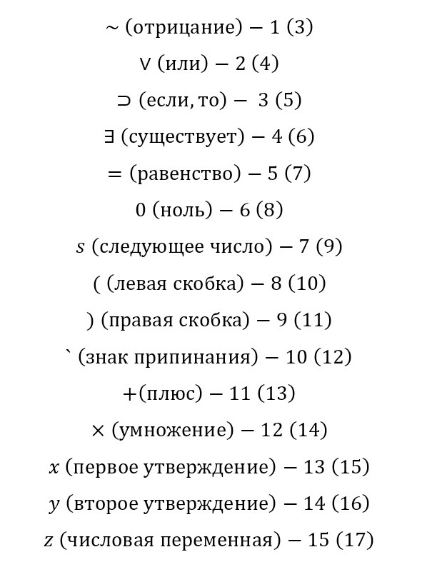 And the proof looked like this. He wanted to use logic and mathematics to find answers to questions about how logic and mathematics work, for which he took all the signs of the mathematical system and assigned each of them its own number, giving the Godel numbering.