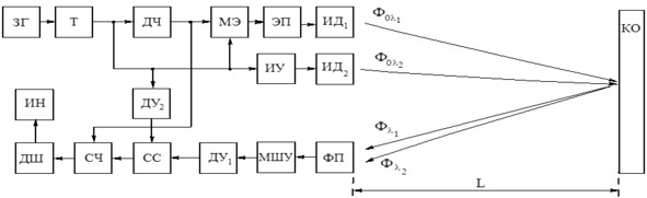The optoelectronic device works as follows. The thermal radiation flux FPI1 (λ) of the control object 1, which is proportional to its temperature, passes the distance l, is modulated by the modulator 2 and enters the sensitive area of the first radiation receiver. The flux reaching the sensitive area of the first radiation receiver, according to the theory of optoelectronic devices, is defined as:
