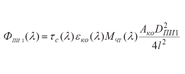 where: tc (λ) is the spectral transmittance of the atmosphere; Mco (λ) is the spectral density of the energy luminosity radiating from the surface of the controlled object; Ako is the area of the radiating surface of the controlled object; DP1 is the diameter of the entrance pupil of the first radiation receiver; l is the distance between the controlled object and the first photodetector.