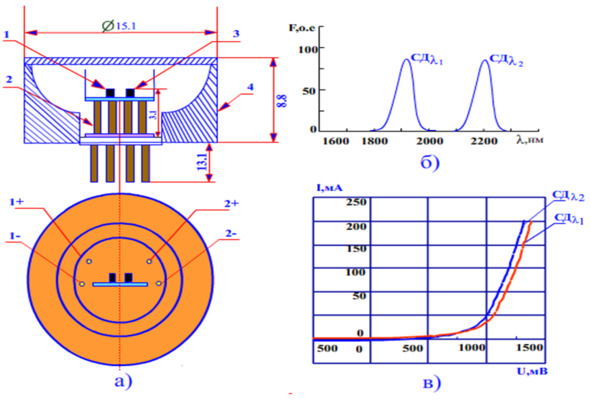 Fig. 3. LED with a parabolic reflector: a) design, b) radiation spectra, c) VAC (where: 1 LED chip (1.94 microns), 2 thermal cooler, 3 LED chip (2.2 microns), 4 parabolic reflector)