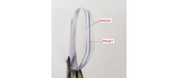 Фацет это поясок треугольного сечения, благодаря которому линза фиксируется в оправе. В рамке ободковых моделей есть паз для фацета; фацет заходит в паз, и линза держится.