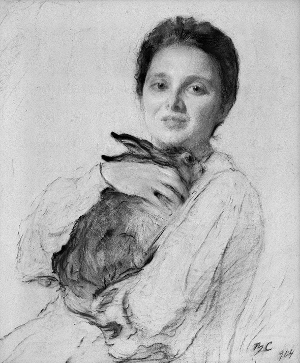 В. А. Серов. Портрет К. А. Обнинской с зайчиком. 1904. Картон, уголь, пастель, сангина. 54,5 × 46