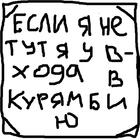 Я уставился на надпись, завис над последним словом. Раскапывал его в своей памяти, но либо ему не хватило в ней ячейки, либо Курямбию с ее входом я никогда не видел. В то, что Курямбия курятник, в котором курят, я верил с трудом.
