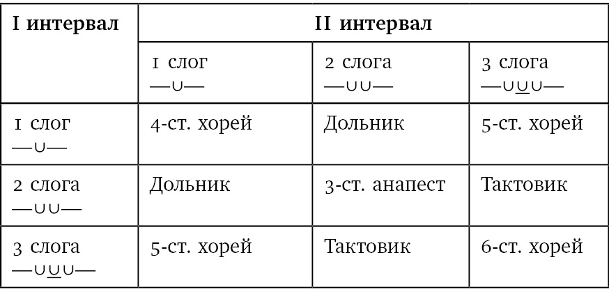 Здесь по вертикали и по горизонтали отложены слоговые объемы междуиктовых интервалов (между I и II и между II и III иктами), а на скрещении этих строк и столбцов помечено, какому размеру созвучна данная ритмическая вариация (четырех-, пяти-, шестистопный хорей, трехстопный анапест, дольник, чистые тактовиковые формы; анакруса везде предполагается двусложная, наиболее частая в народном стихе). По этой таблице легко представить, как с расшатыванием размера увеличивается число доступных для него ритмических вариаций. Силлабо-тонический анапест, допускающий лишь один вид междуиктового интервала, двусложный, покрывает в этой таблице лишь одну клетку; дольник, допускающий два вида интервалов, покрывает четыре клетки (правда, одна из этих вариаций, созвучная четырехстопному хорею, «Зажигал последний свет» малоупотребительна): тактовик с его тремя видами интервалов распространяется на все девять клеток[41].