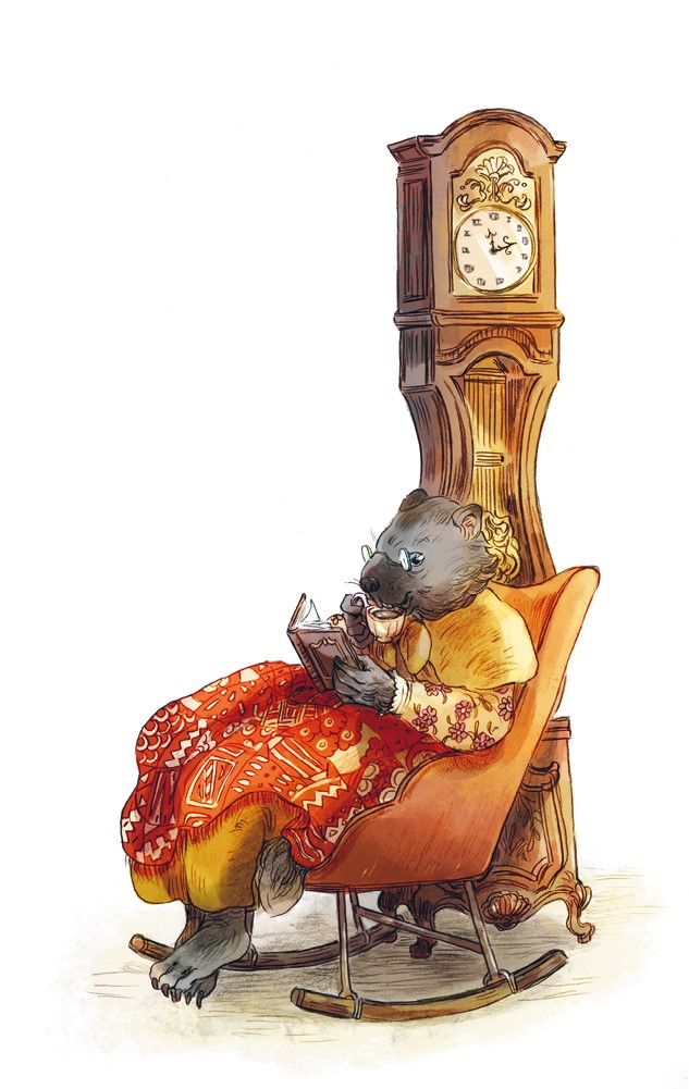 Действительно, в углу зала, рядом с большими часами, в кресле уютно устроилась старая серая сурчиха она читала какой-то роман и маленькими глоточками пила чай из изящной чашки.