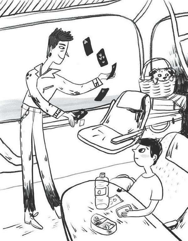Он манит Финна рукой и при этом роняет колоду карты разлетаются во все стороны и падают под столом и сиденьями.