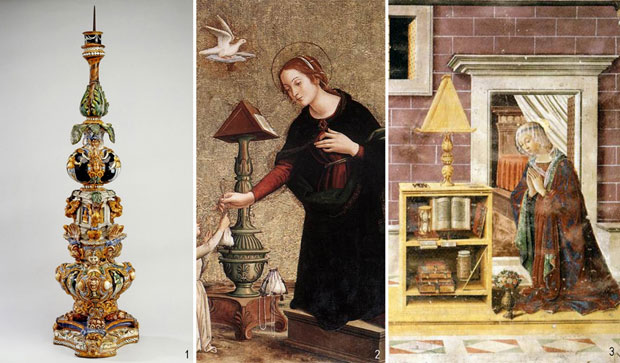 1. Один из пары подсвечников из Урбино. 15801600-е гг. Майолика. Мастерская Патанацци. В. 112 см. ГЭ. 2. Худ. Антониаццо Романо. Благовещение. 14991500 гг. (Подсвечник /?/ на подставке под колпаком справа от Богородицы). 3. Худ. Себастьяно Майнарди. Благовещение. 1482 г. Фрагмент фрески в баптистерии соборной церкви Санта-Мария-Ассунта в городе Сан-Джиминьяно (Италия)