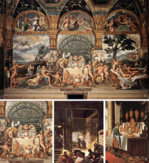 1. Худ. Джулио Романо и ученики. Стена с фреской «Олимпийские боги пируют на Олимпе» в зале Психеи в палаццо дель Те (Мантуя). 15251535 гг. 2. Деталь фрески «Олимпийские боги пируют на Олимпе». 3. Худ. Якопо Тинторетто. Тайная вечеря. 1579 г. Фрагмент. 4. Нидерландский худ. Бартоломеус ван Бассен. Ренессансный интерьер с пирующими. 16181620 гг. Фрагмент