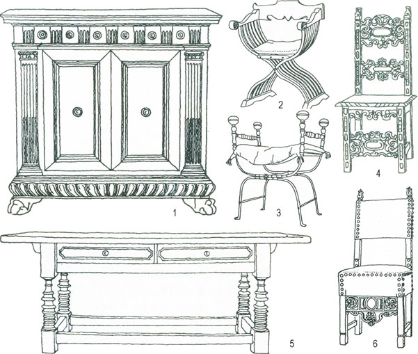 1. Посудный шкаф. Ок. 1580. 2. Складной курульный стул-кресло. 3. Стул. Железо, бронза. 4. Резной стул. 5. Стол с точеными ножками и подстольем с ящиками. 6. Стул с кожаной обивкой