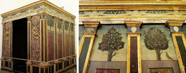 В палаццо Дукале (Урбино) сохранилась небольшая деревянная камера, украшенная росписью (ил. 43.12) и предназначенная для установки в ней кровати. Возможно, это был оригинальный зимний вариант для размещения ложа.